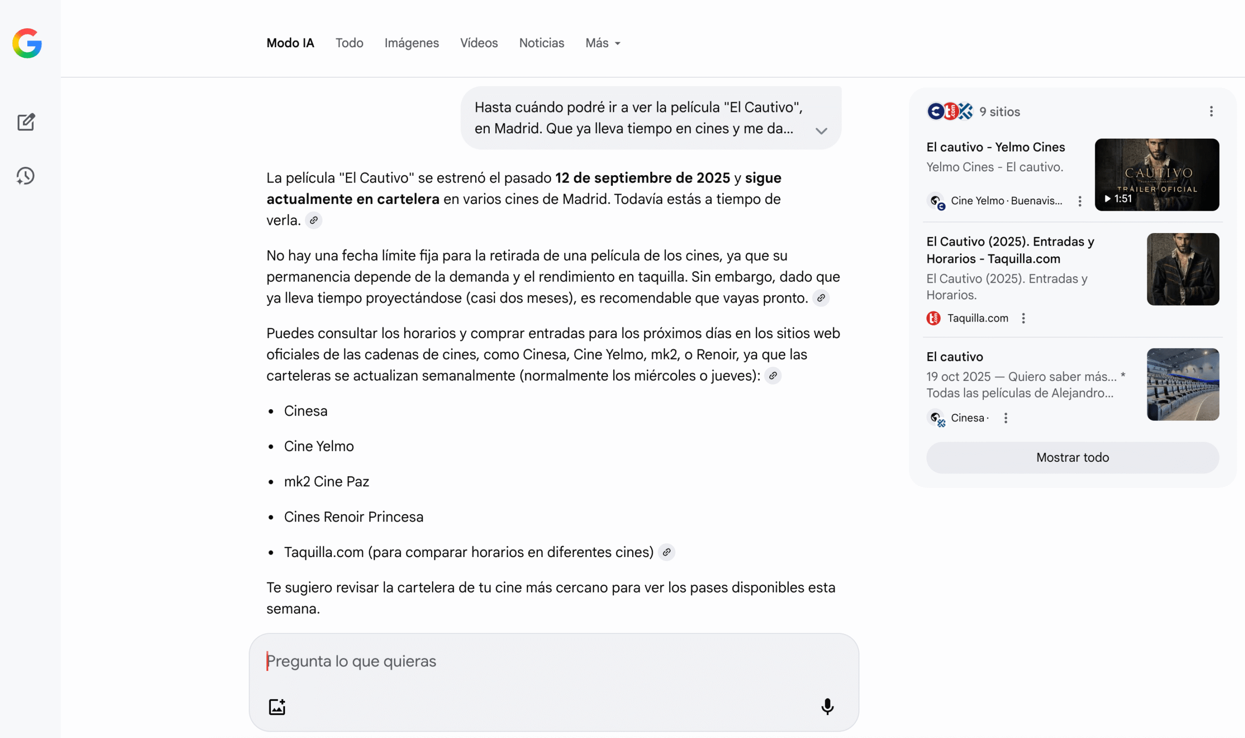 - Generación de la respuesta: el AI Mode reúne y sintetiza la información de múltiples fuentes. Con esto construye uno o más párrafos coherentes al estilo de una conversación que el usuario puede consumir de inmediato